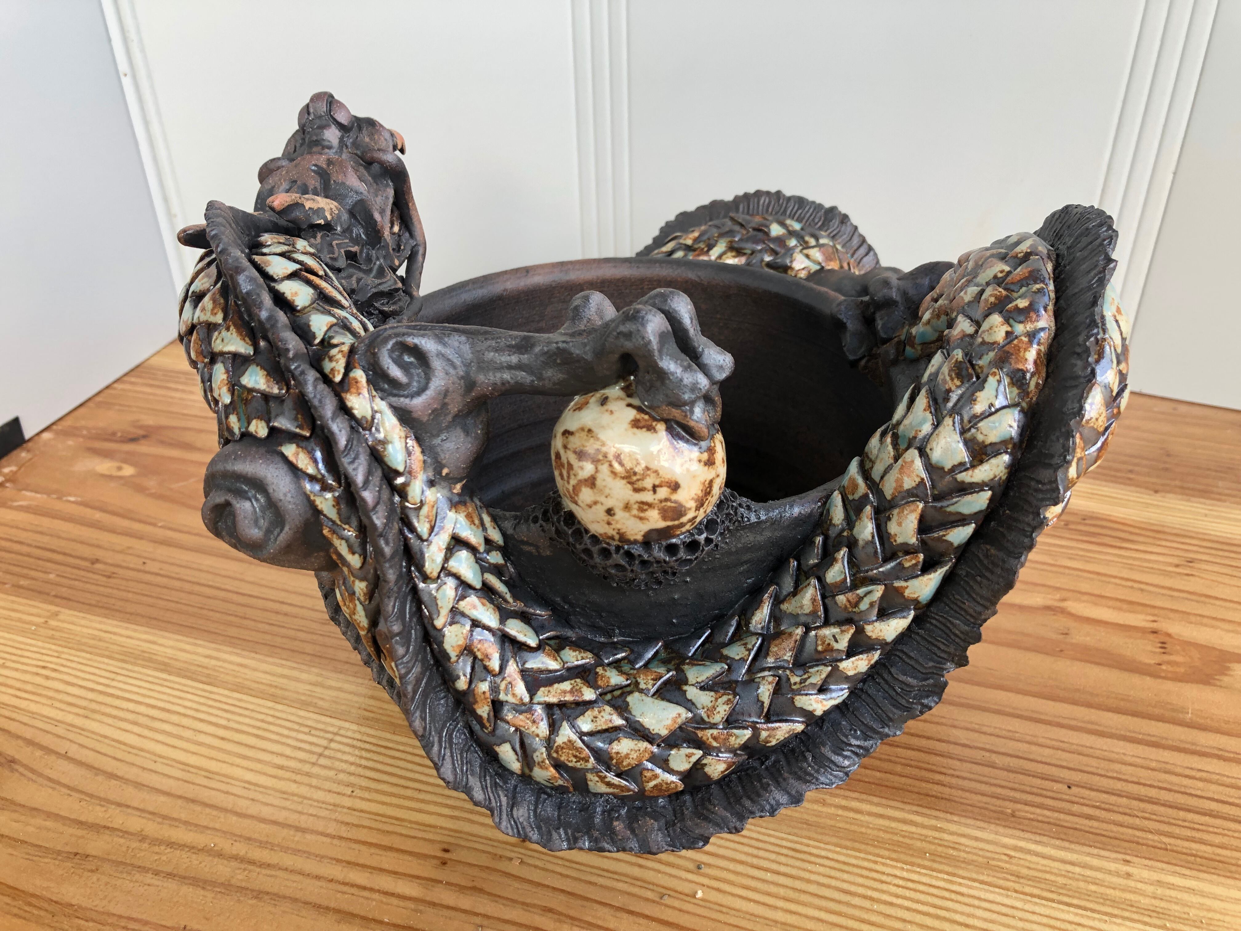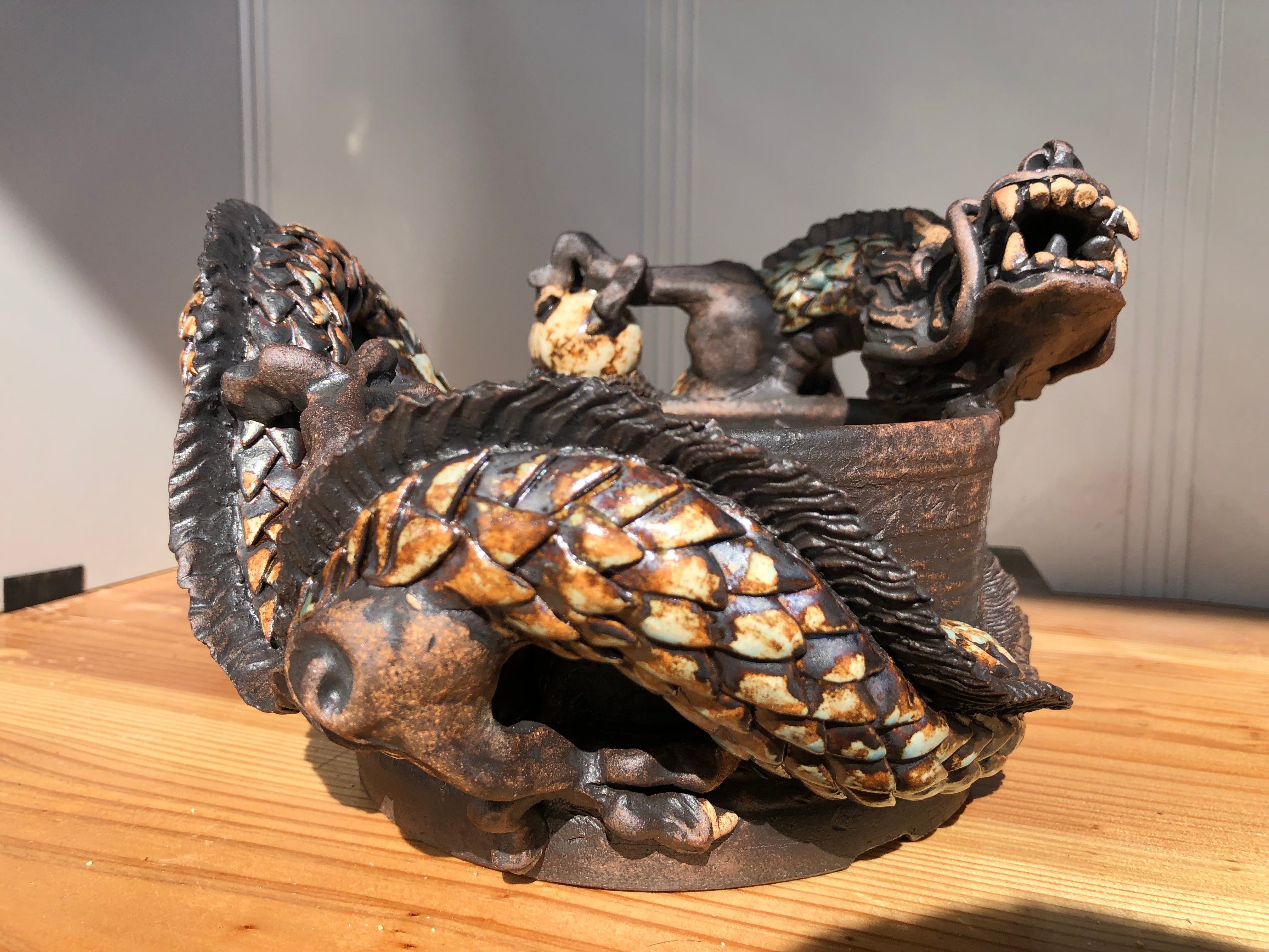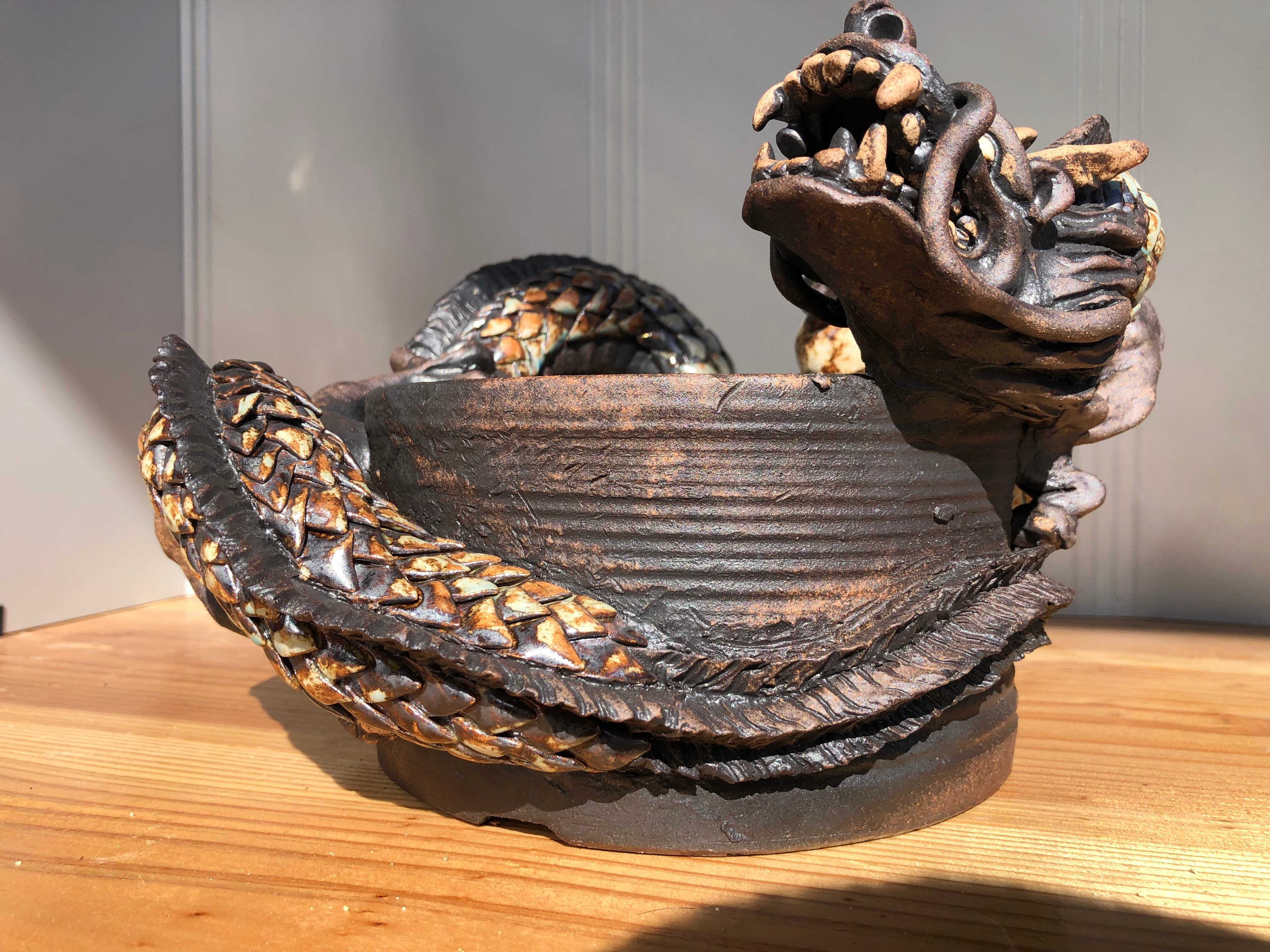 ロクロで成形した鉢に、手び練りで龍を巻き付けた一点物の作品です。