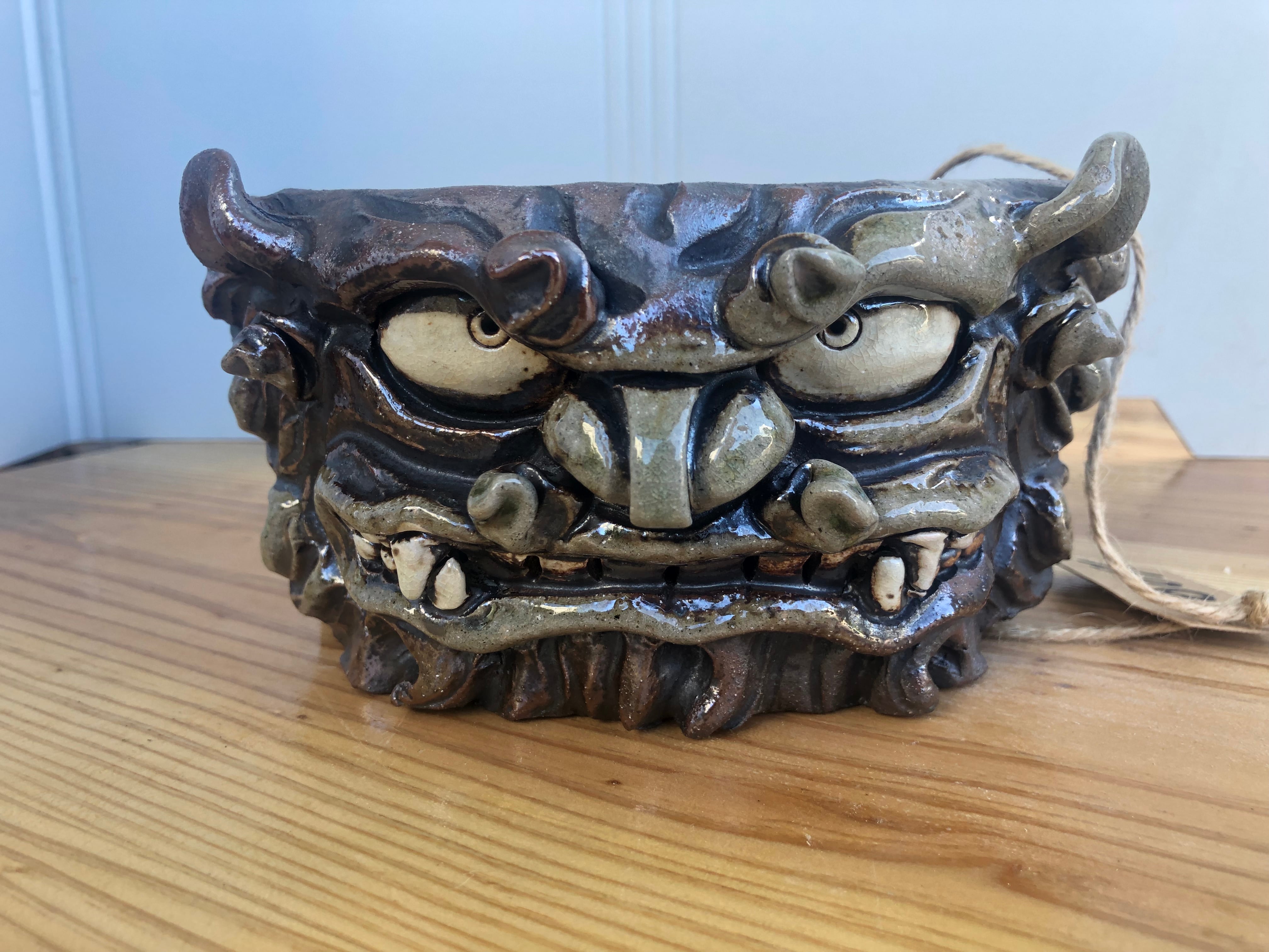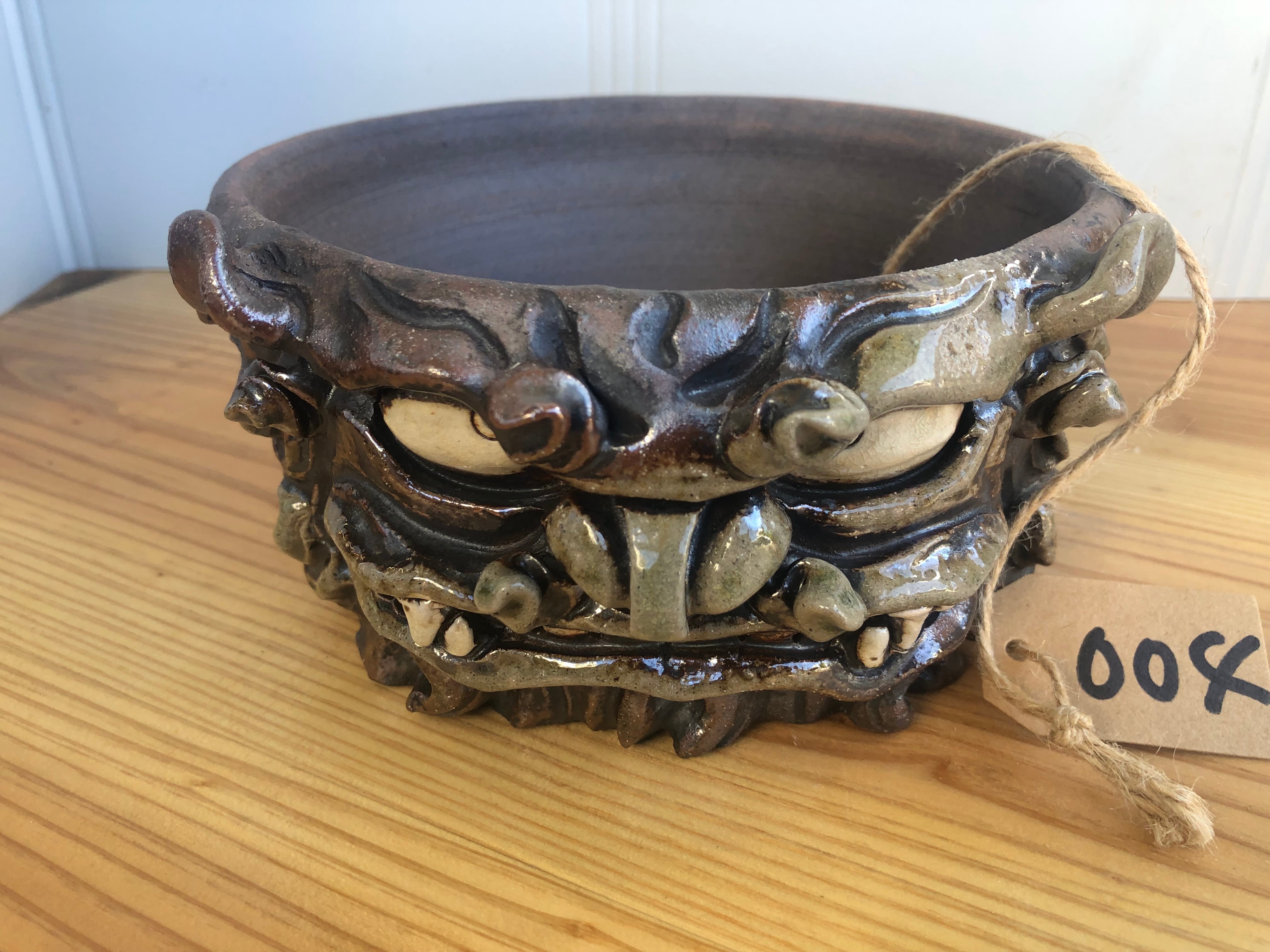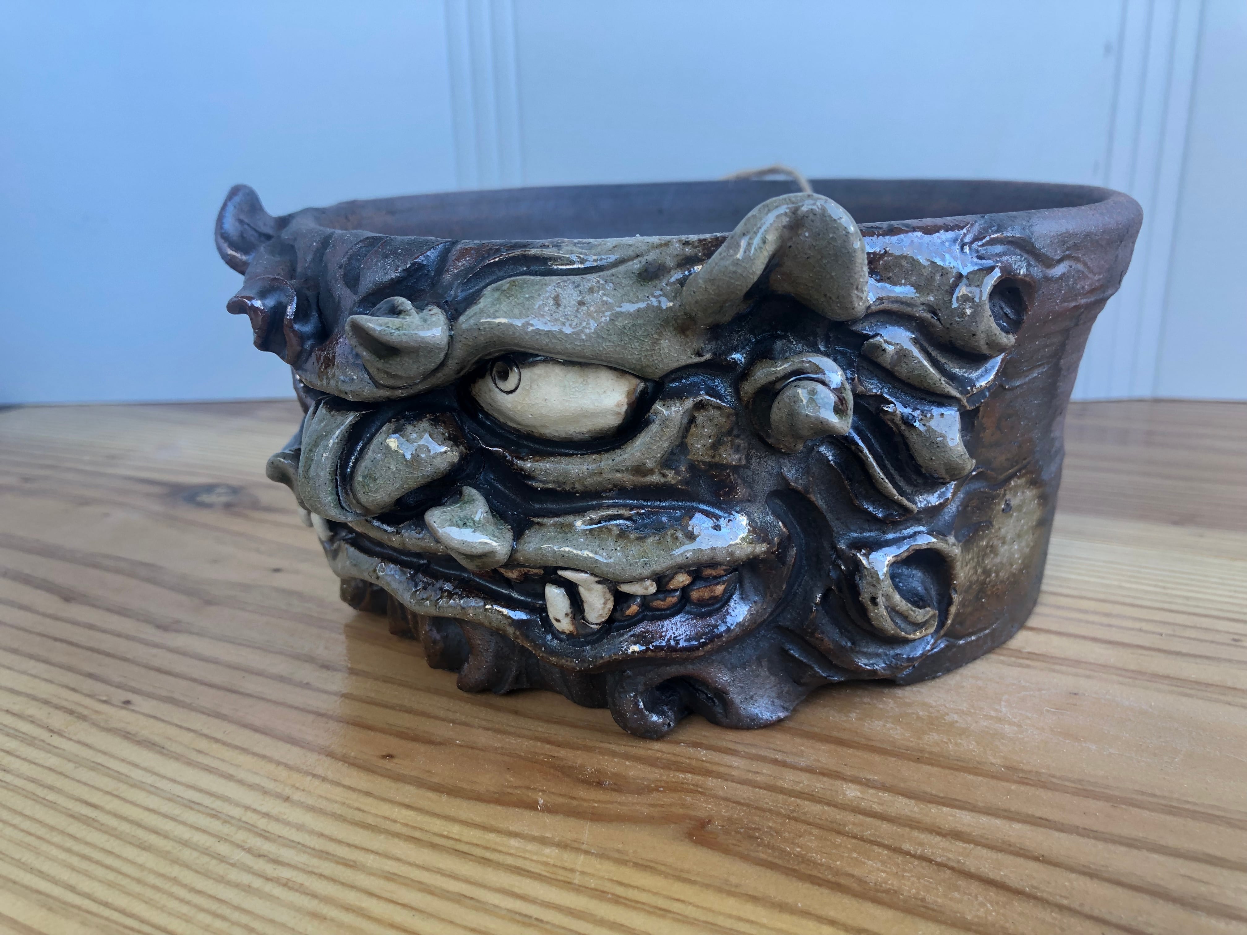ロクロで成形した鉢に、手び練りでシーサーをあしらった一点物の作品です。