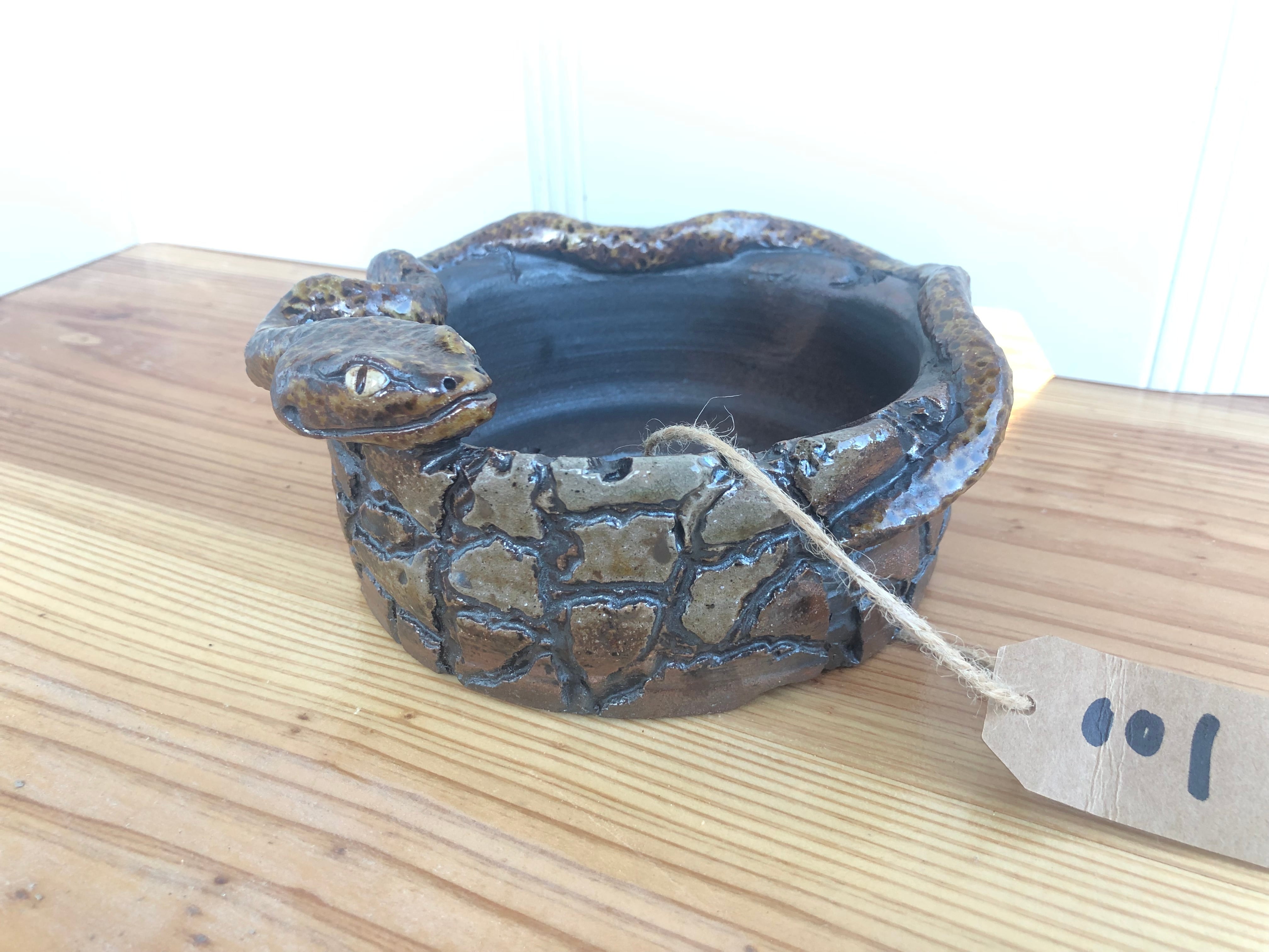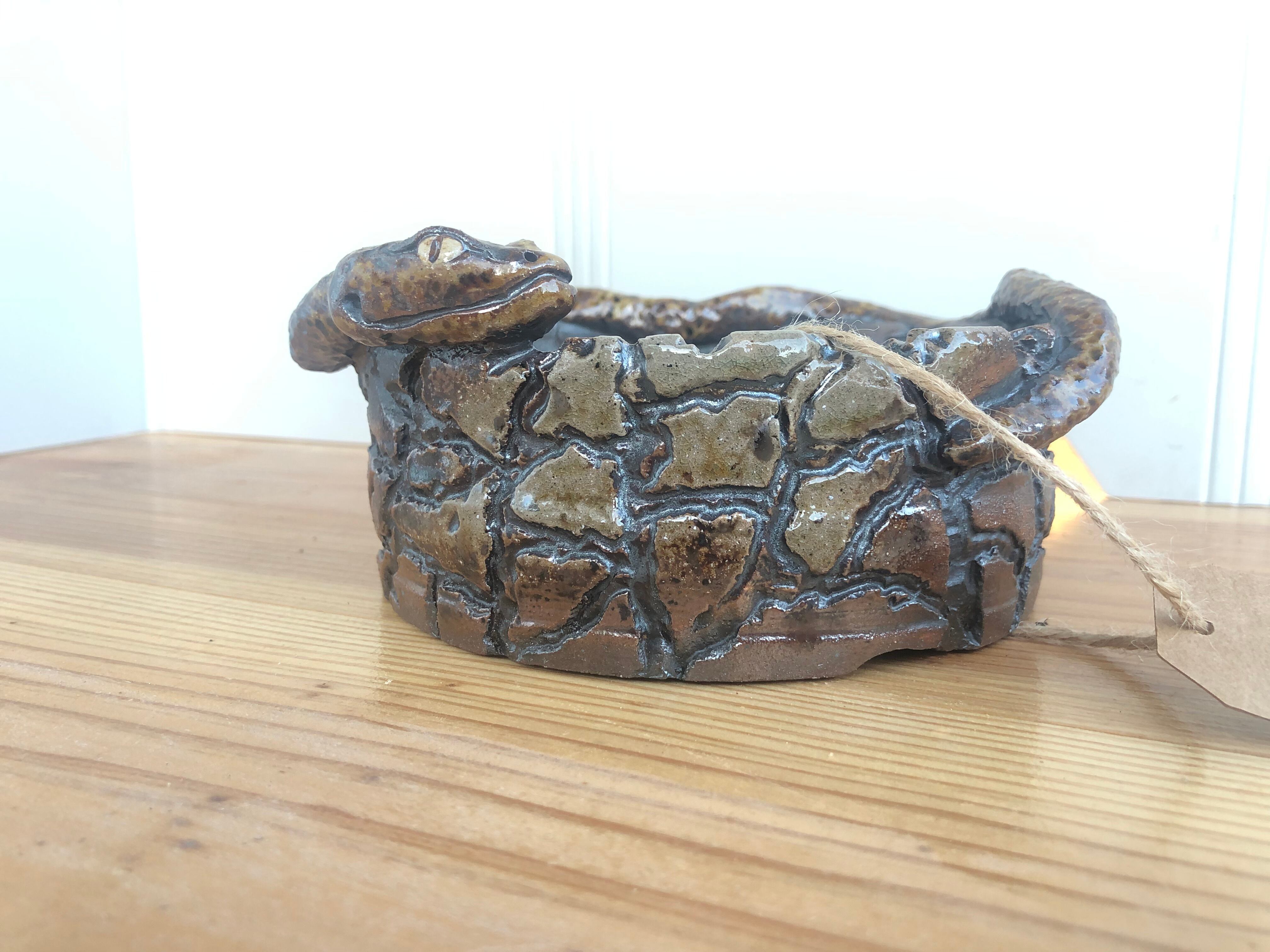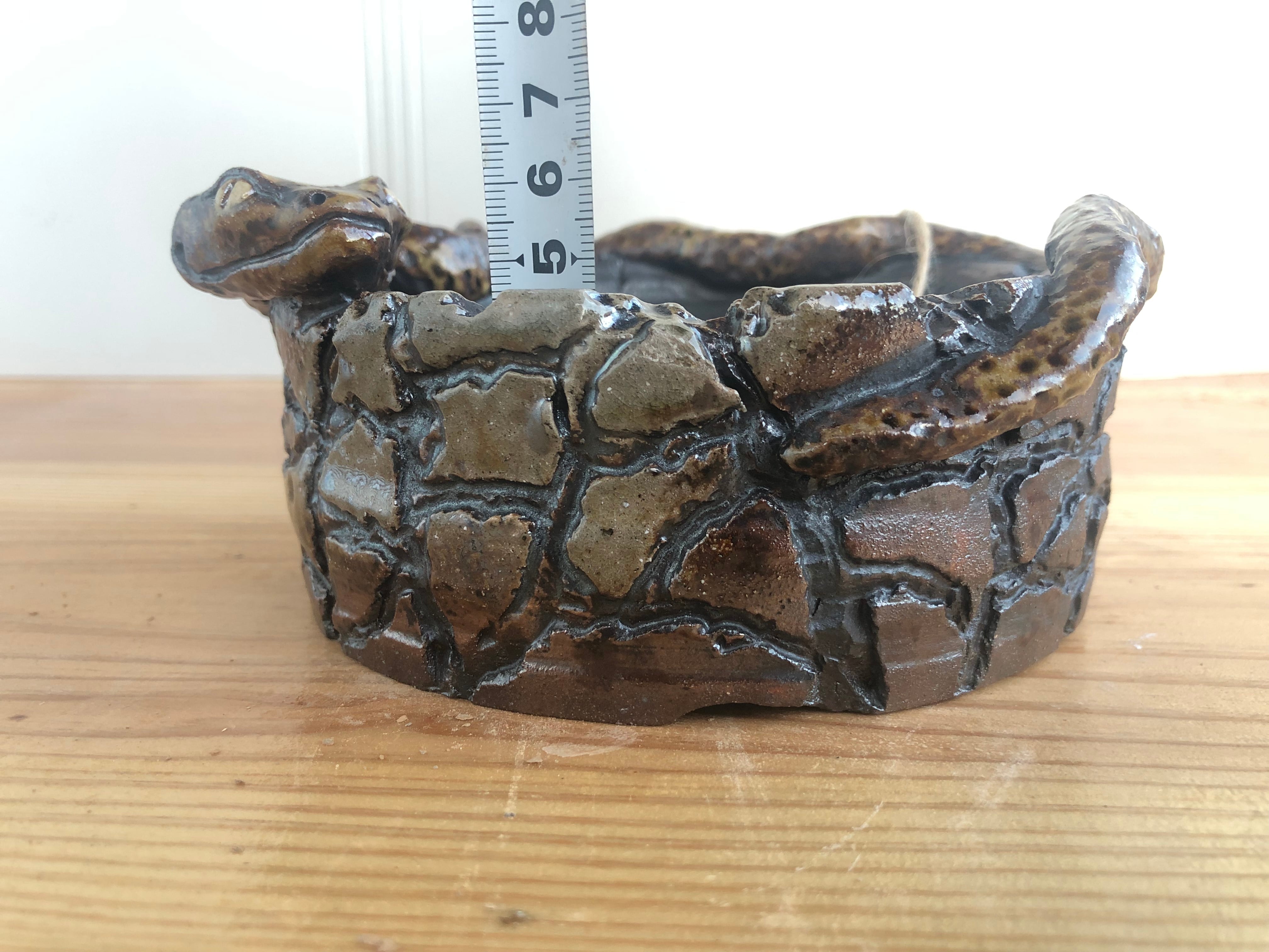 ロクロで成形した鉢に、手び練りでハブを巻きつけた一点物の作品です。鉢のサイズは内径 約12cm・深さ 約4.5cm。