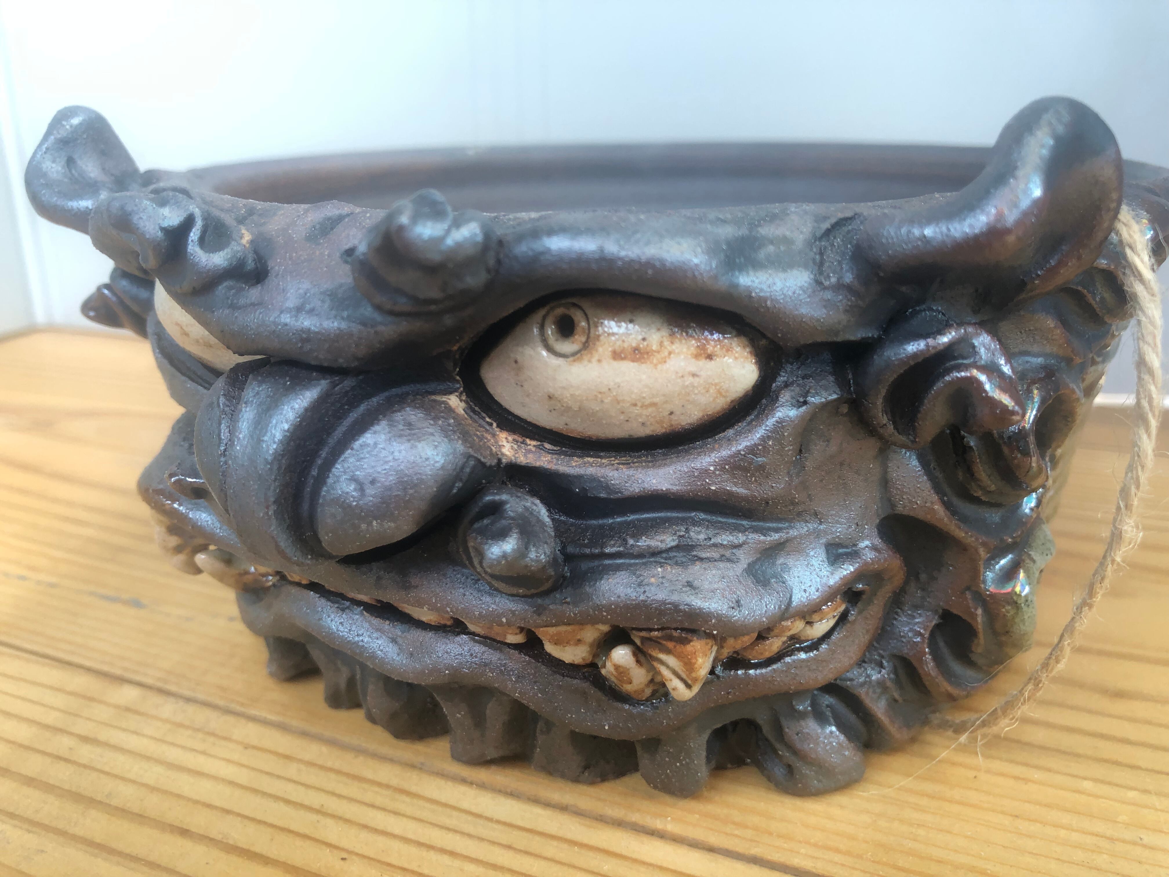 ロクロで成形した鉢に、手び練りでシーサーをあしらった一点物の作品です。