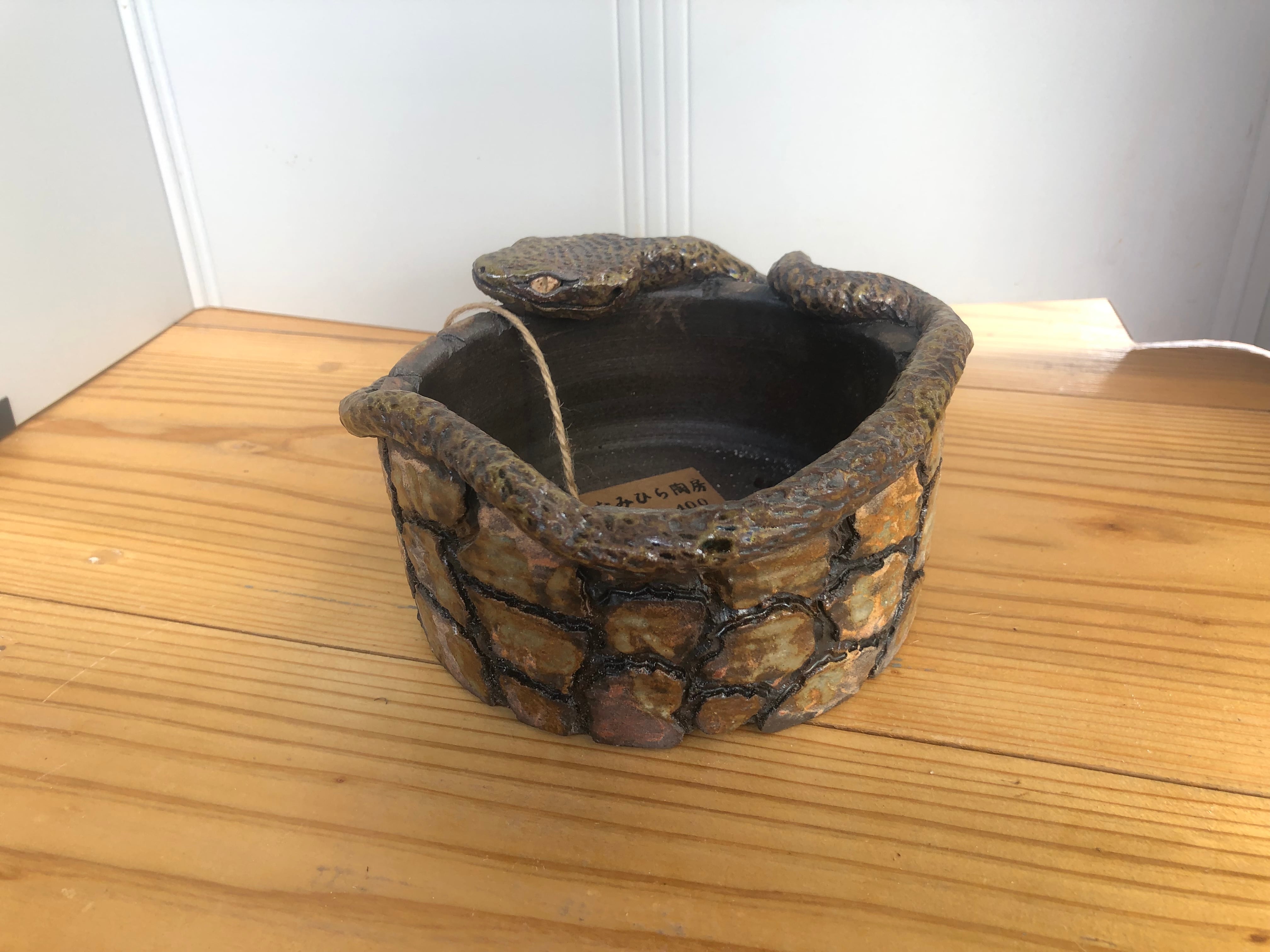 ロクロで成形した鉢に、手び練りでハブを巻きつけた一点物の作品です。