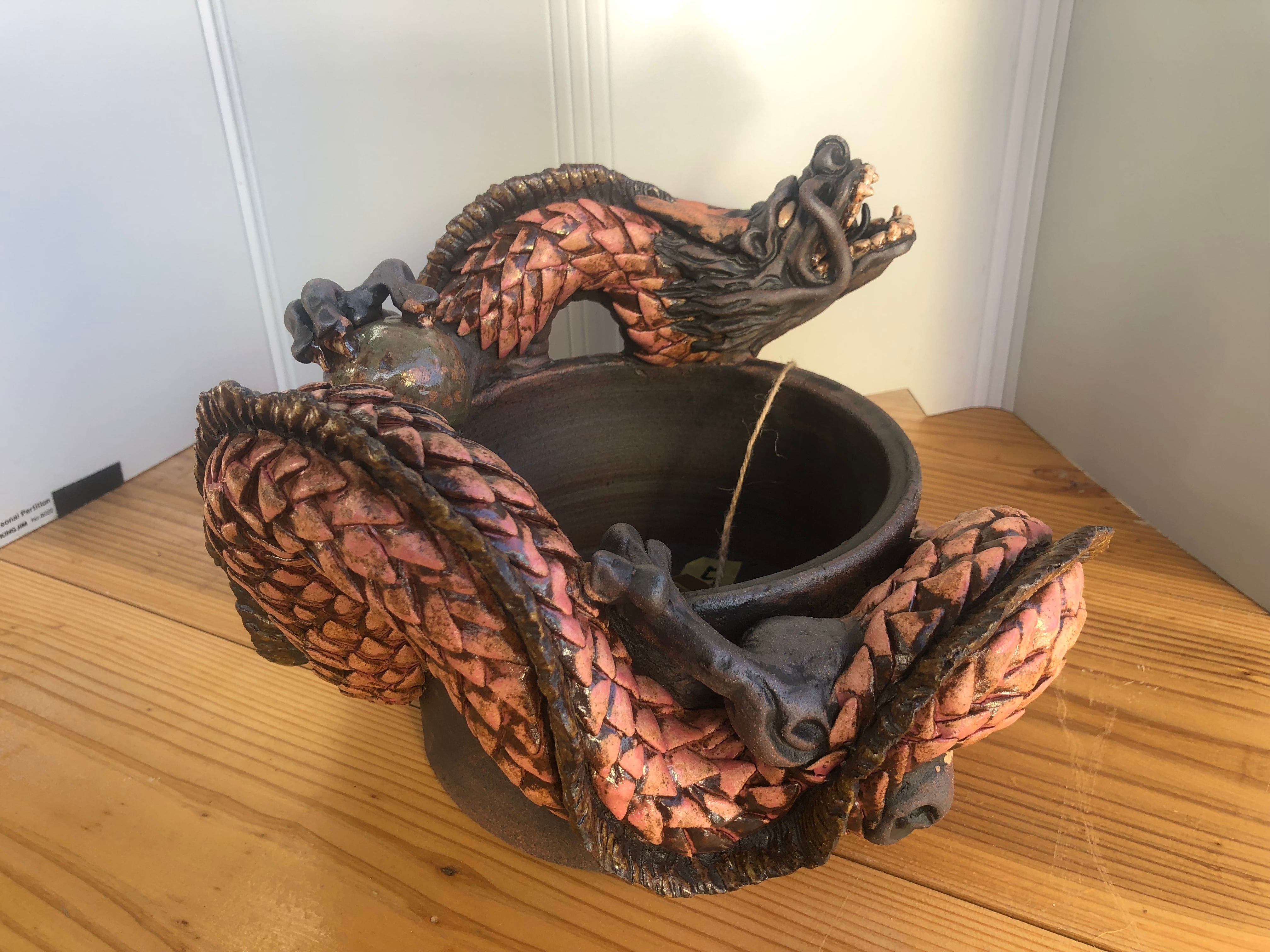 ロクロで成形した鉢に、手び練りで龍を巻き付けた一点物の作品です。