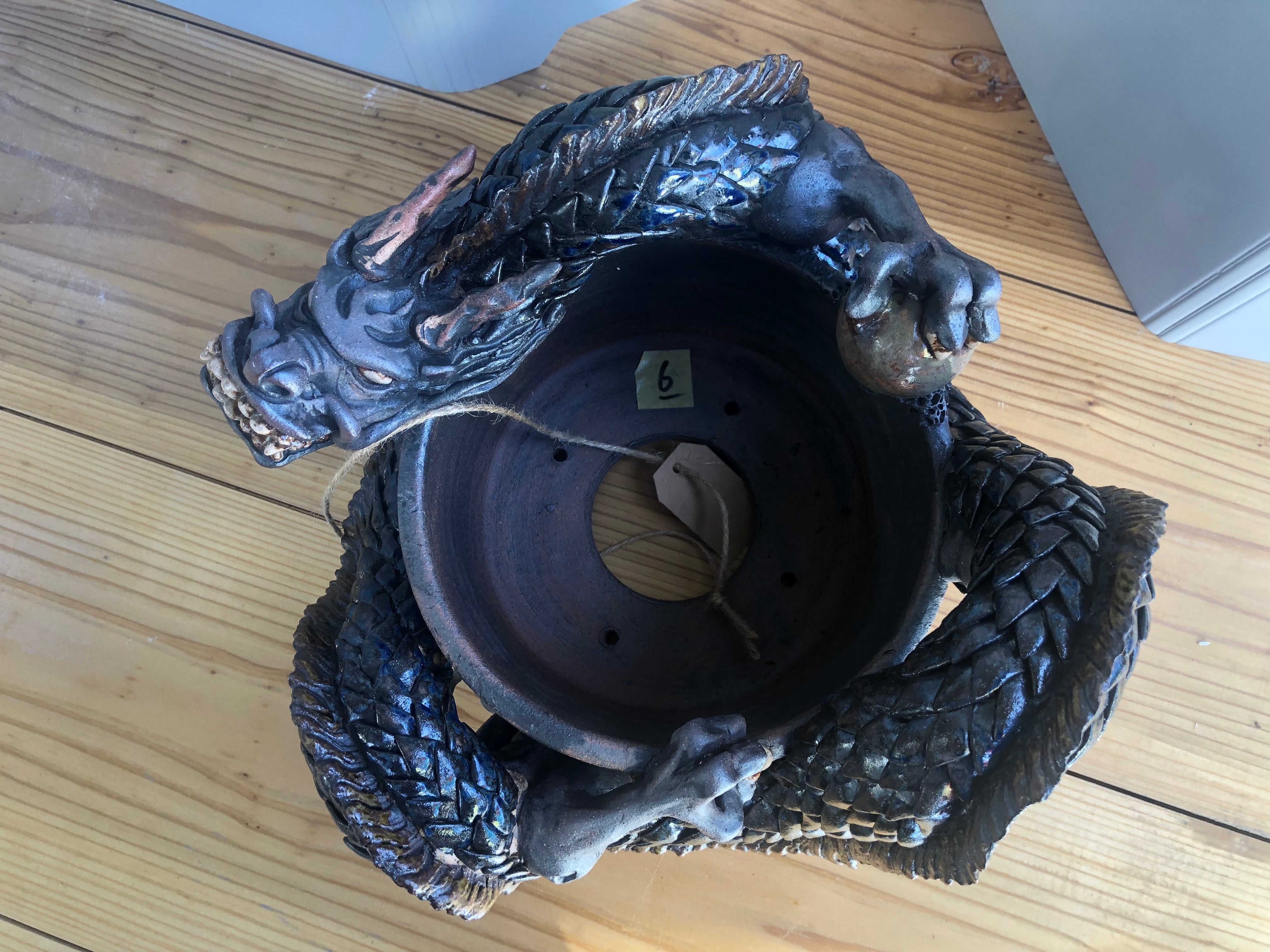 ロクロで成形した鉢に、手び練りで龍を巻き付けた一点物の作品です。