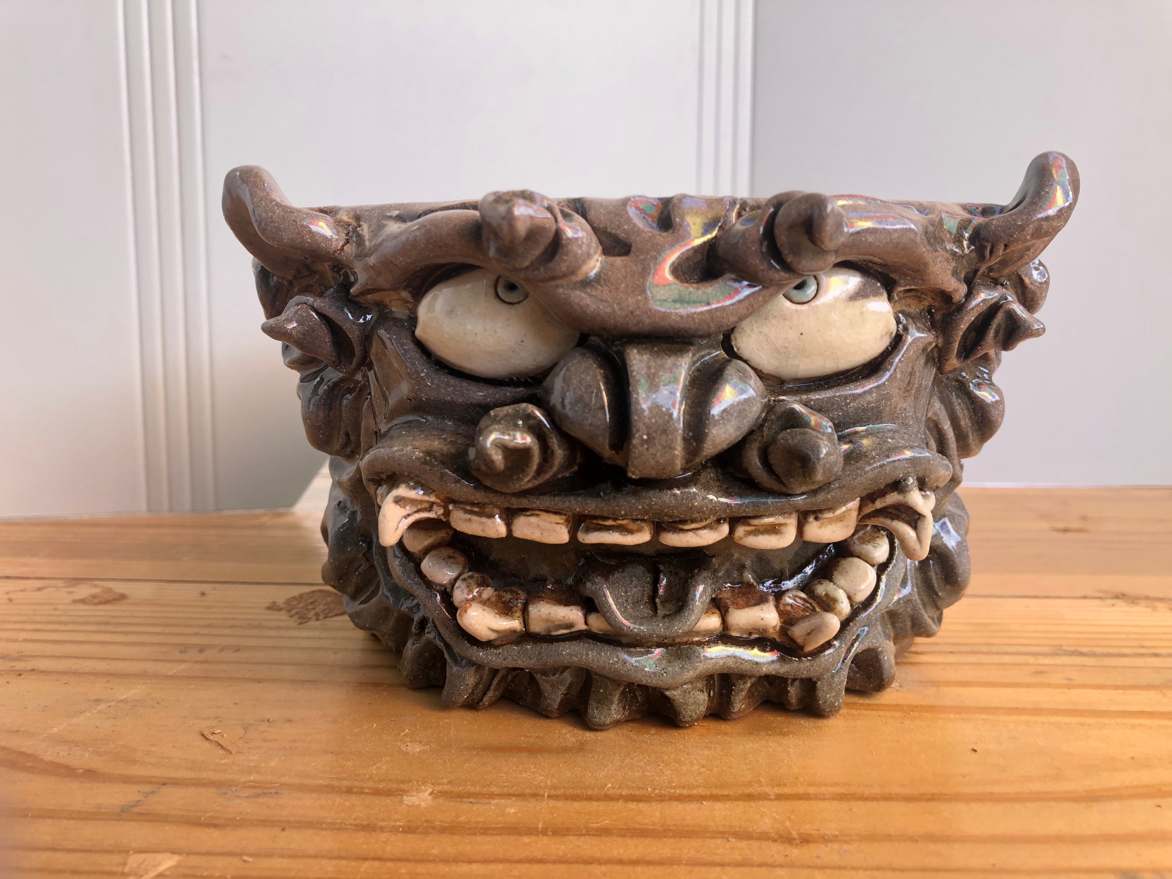 ロクロで成形した鉢に、手び練りでシーサーをあしらった一点物の作品です。