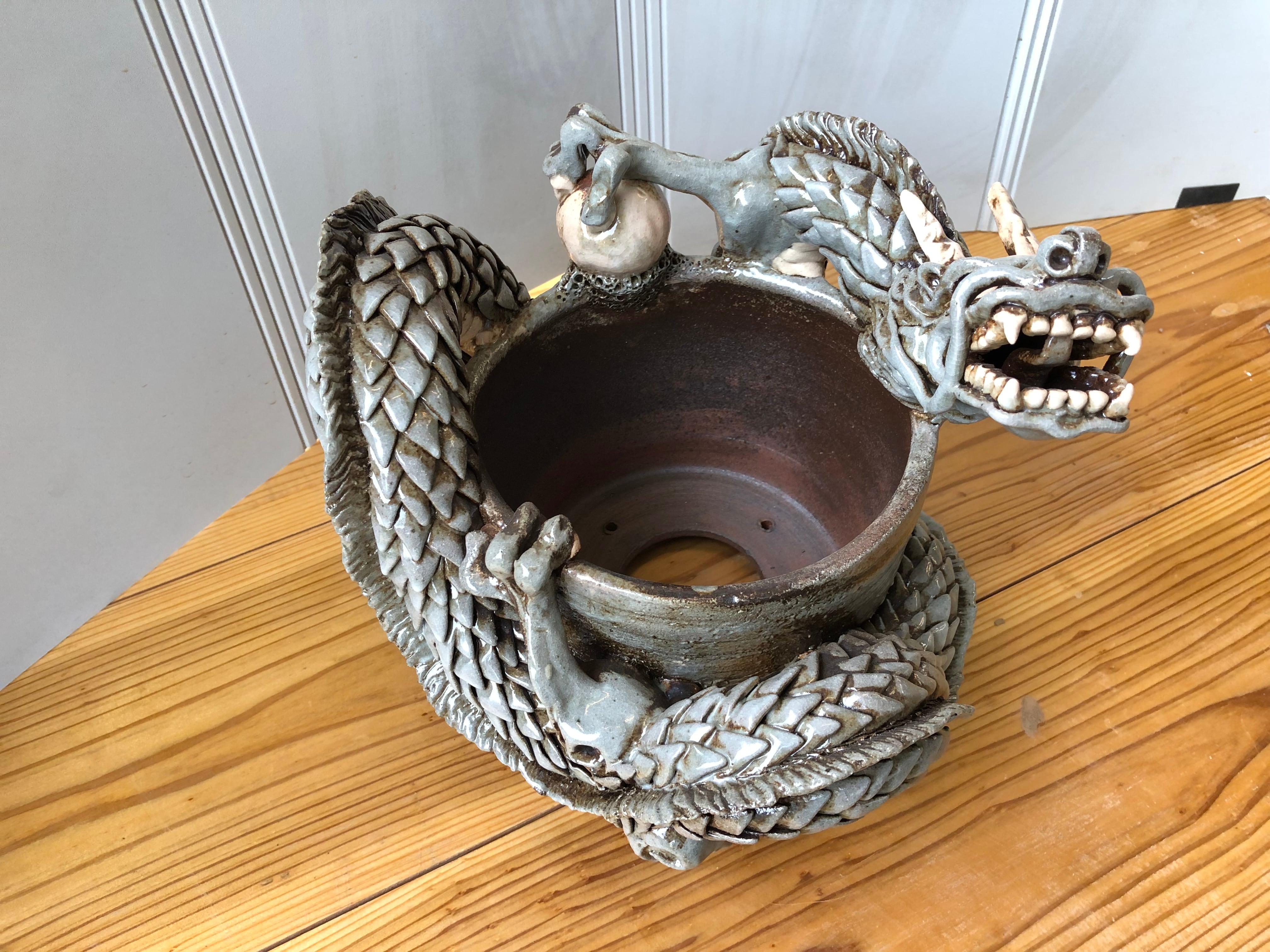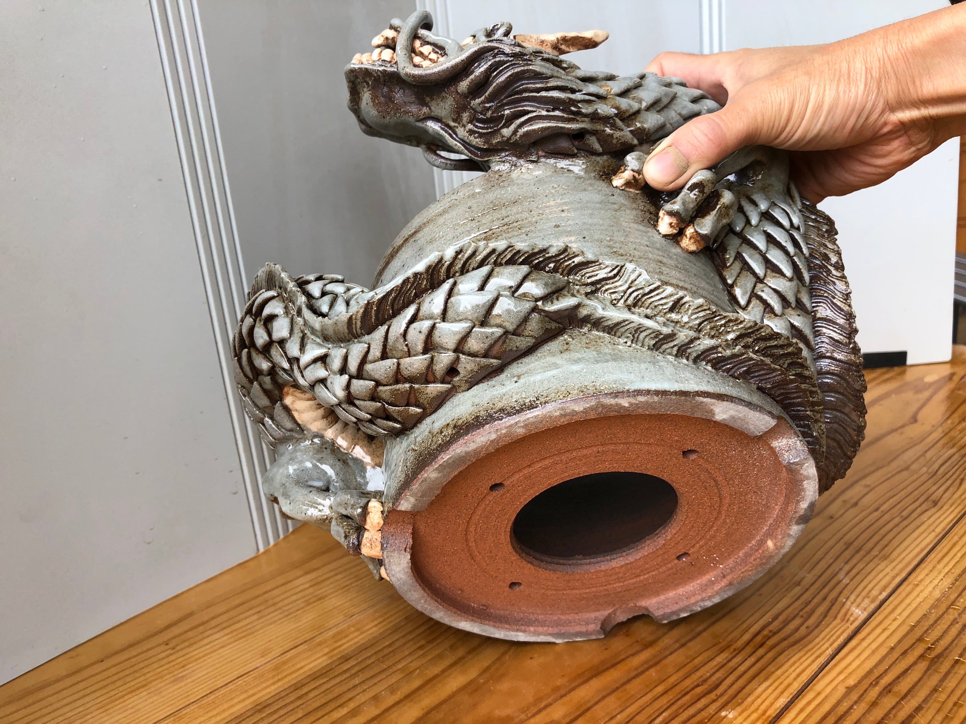 ロクロで成形した鉢に、手び練りで龍を巻き付けた一点物の作品です。