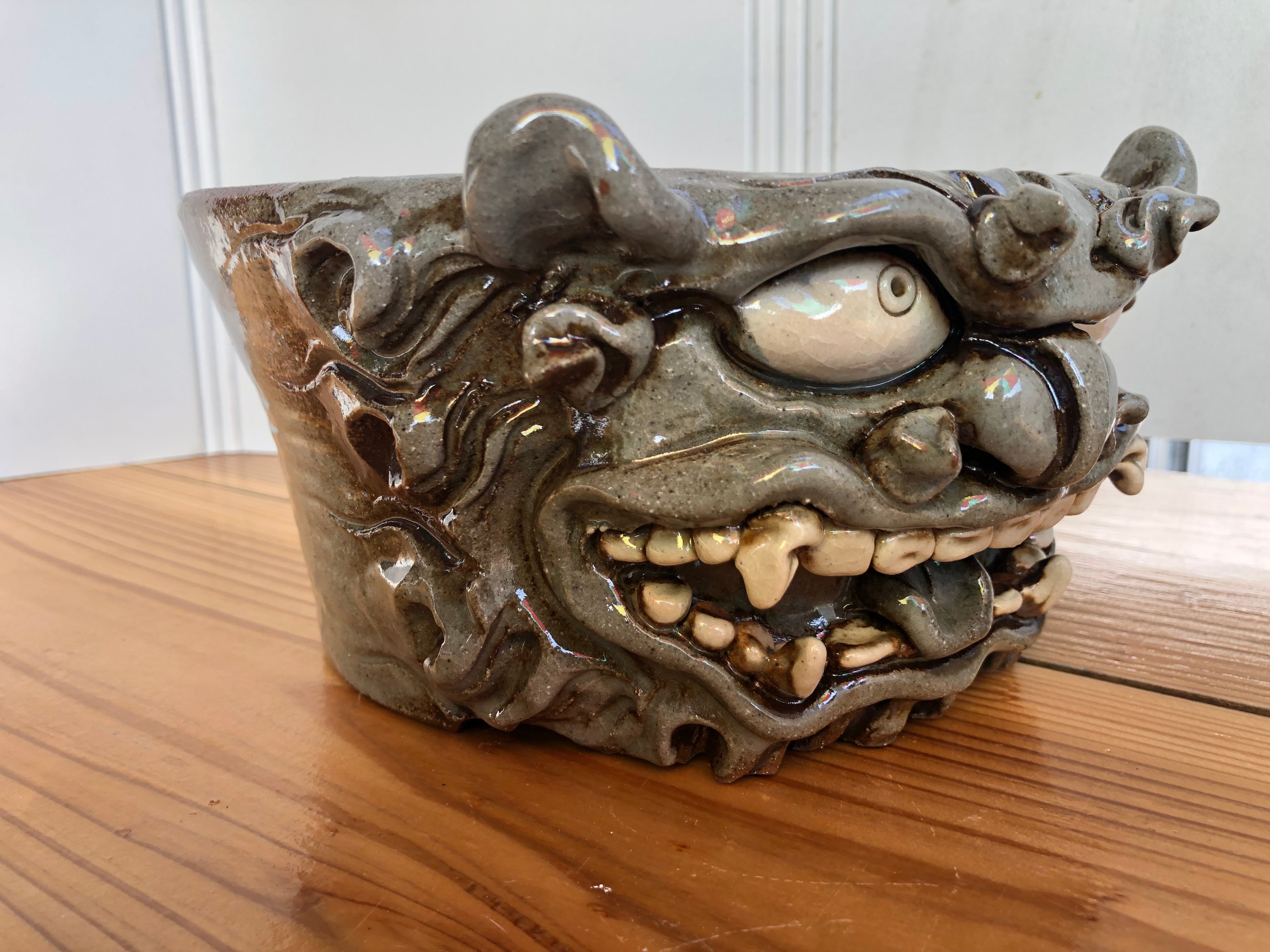ロクロで成形した鉢に、手び練りでシーサーをあしらった一点物の作品です。