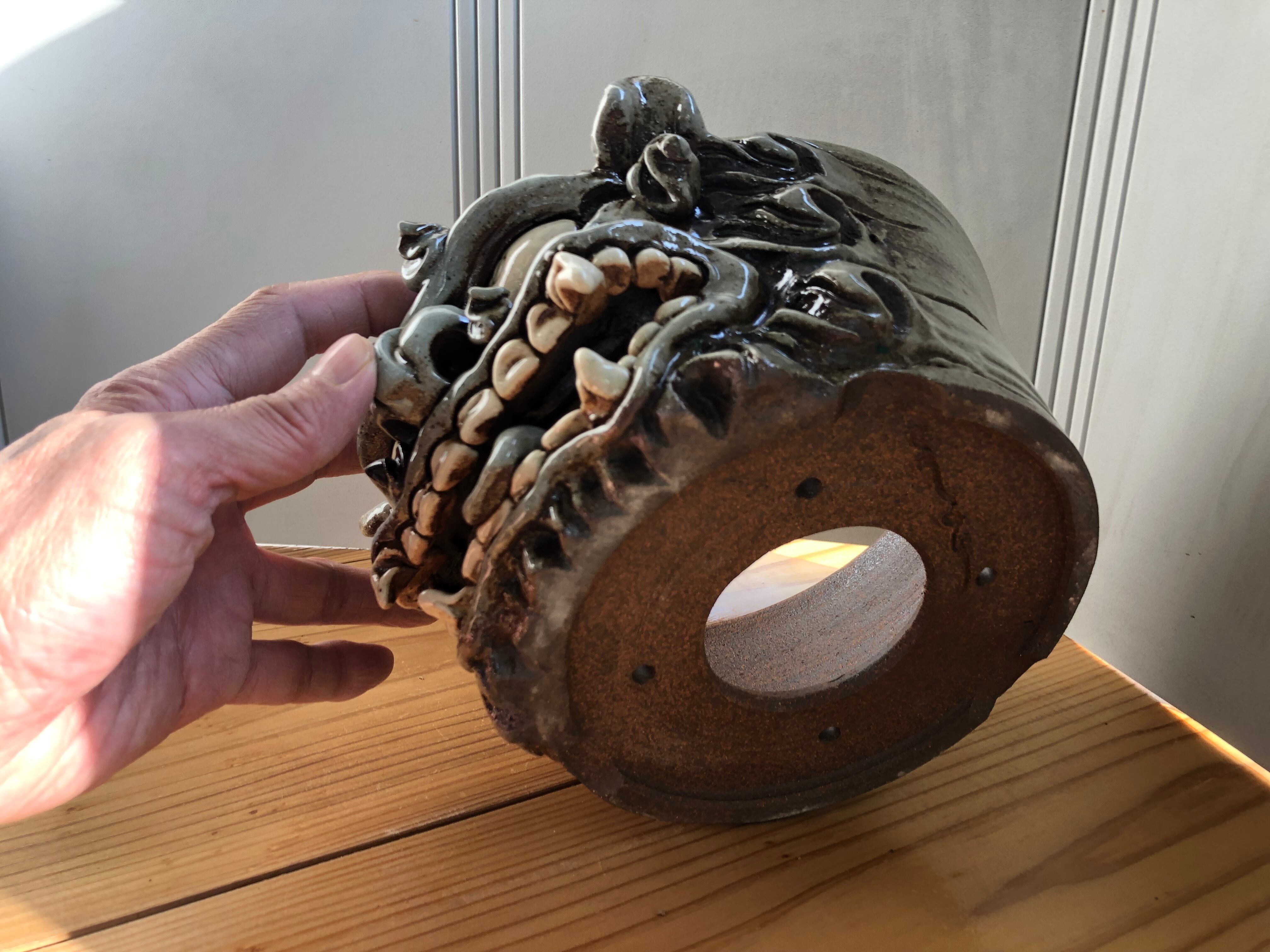 ロクロで成形した鉢に、手び練りでシーサーをあしらった一点物の作品です。
