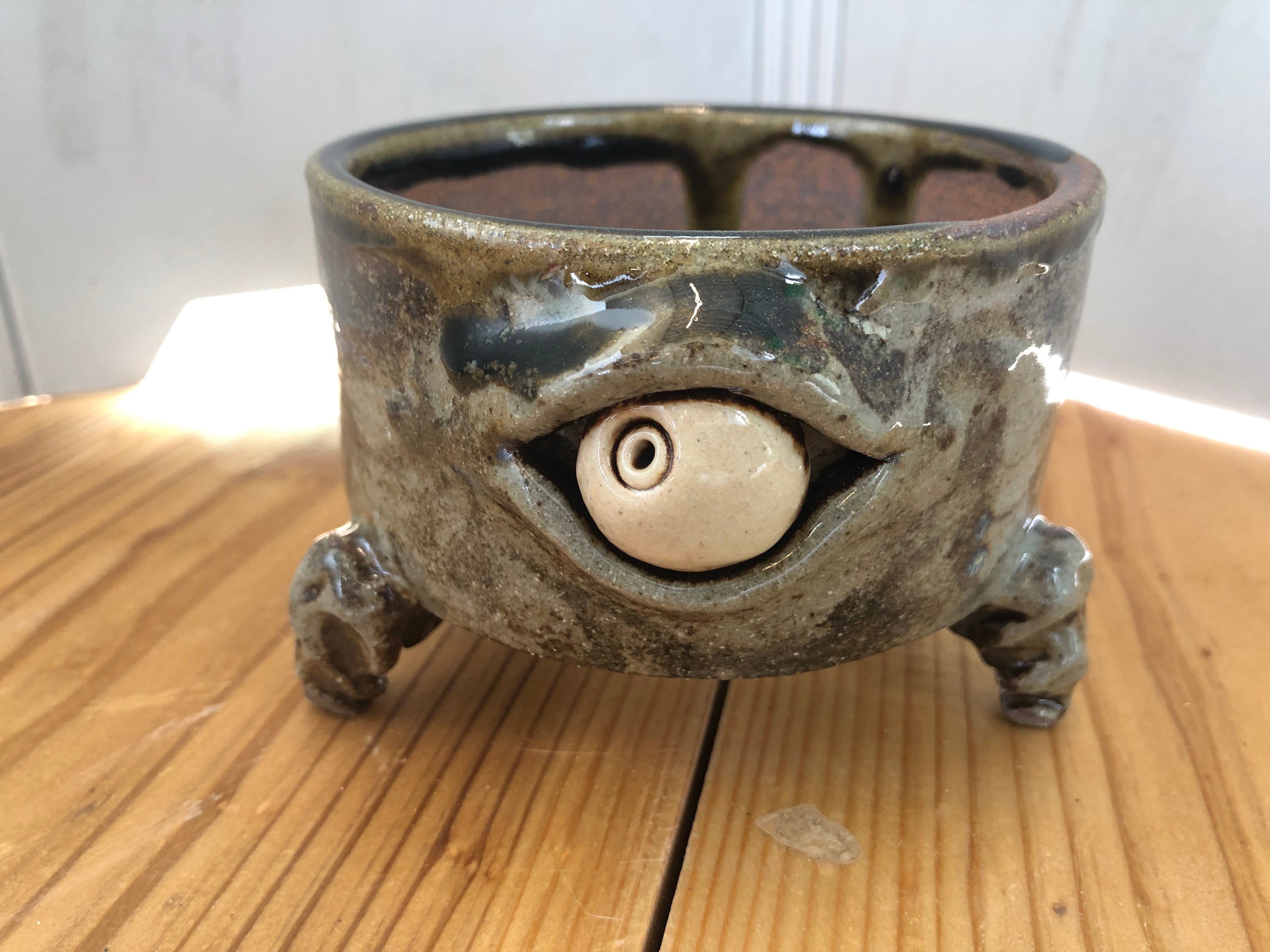 ロクロで成形した鉢に、手び練りで「ひとつ目」をあしらった一点物の作品です。