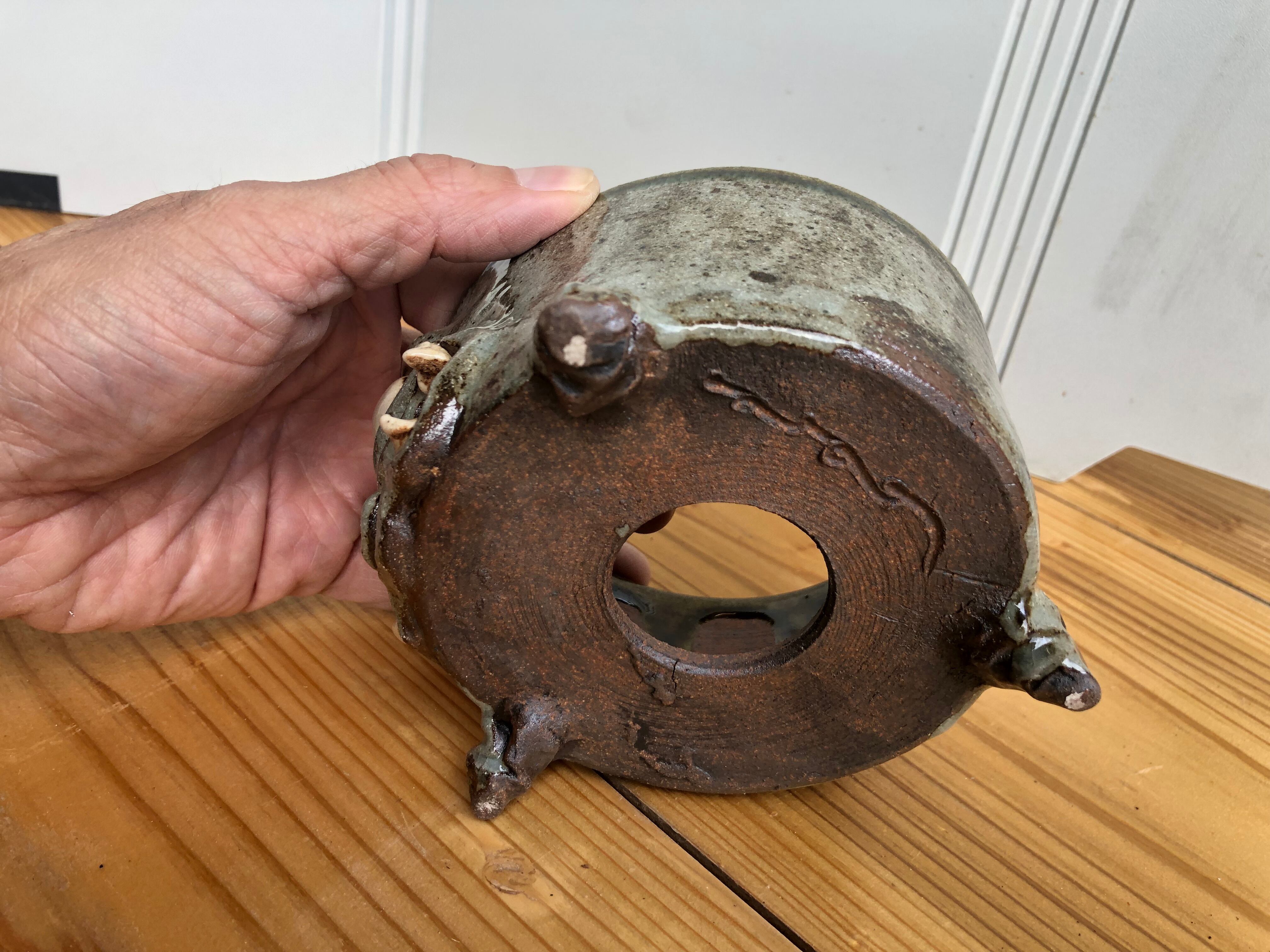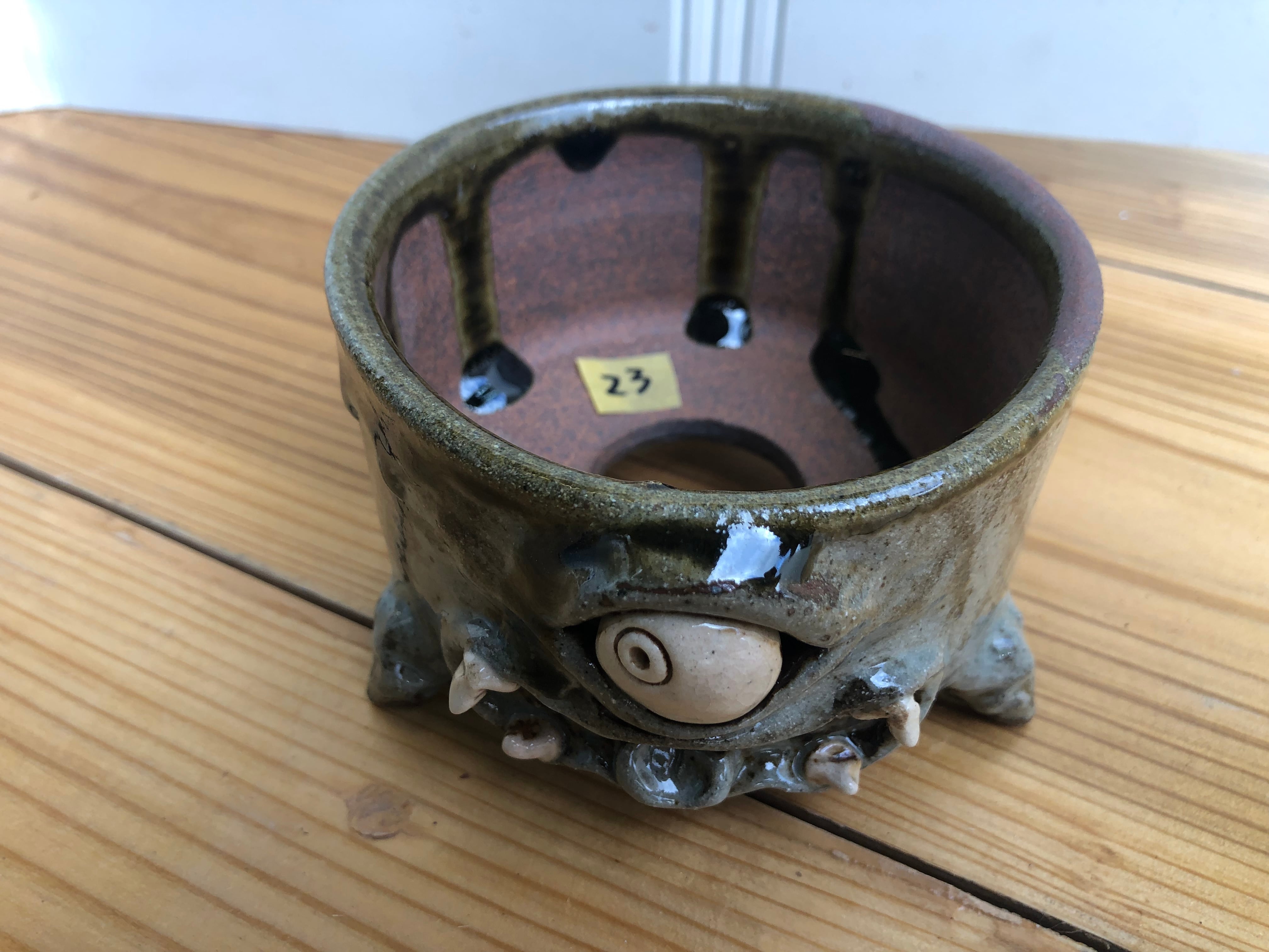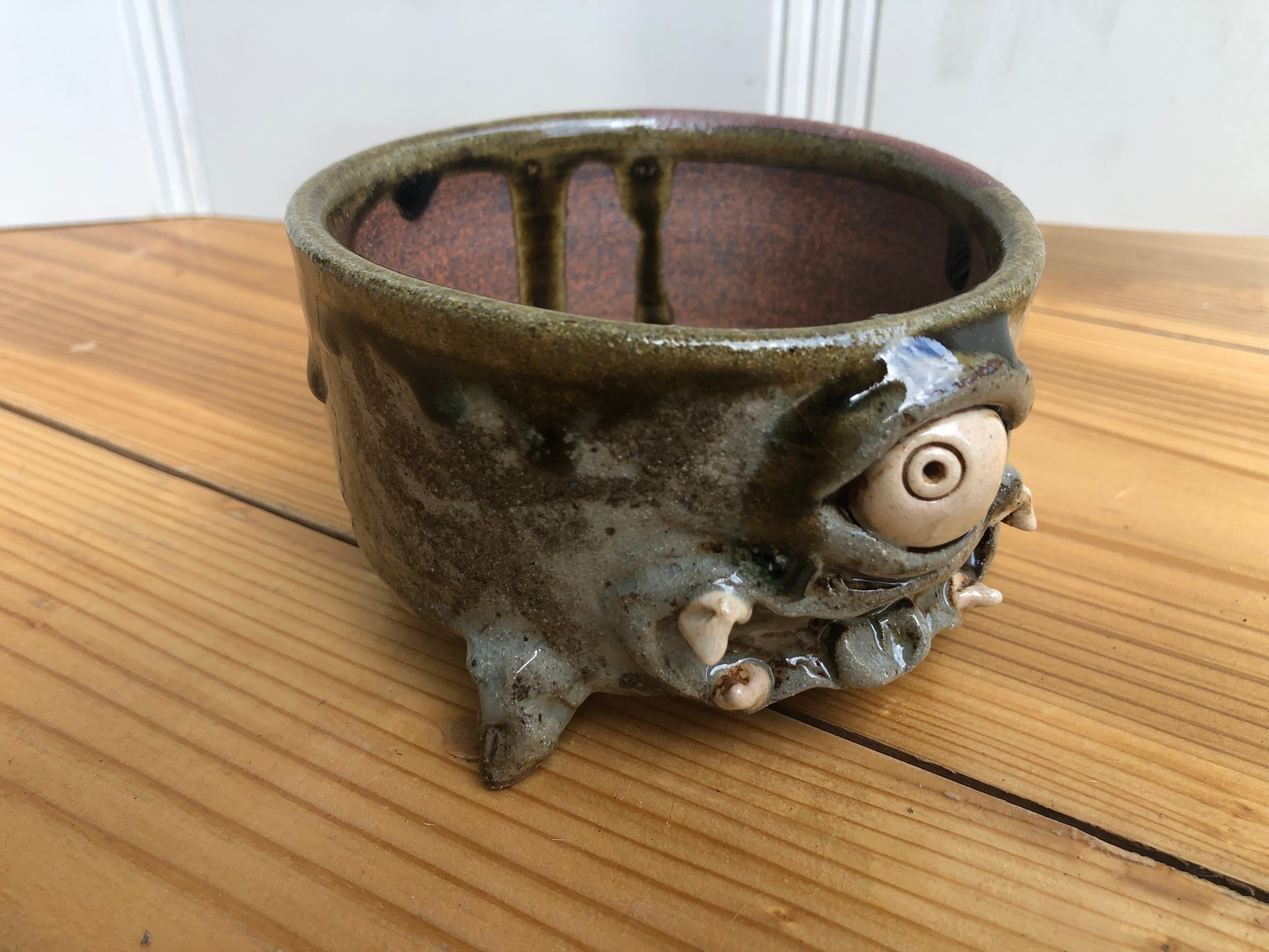 ロクロで成形した鉢に、手び練りで「ひとつ目」をあしらった一点物の作品です。