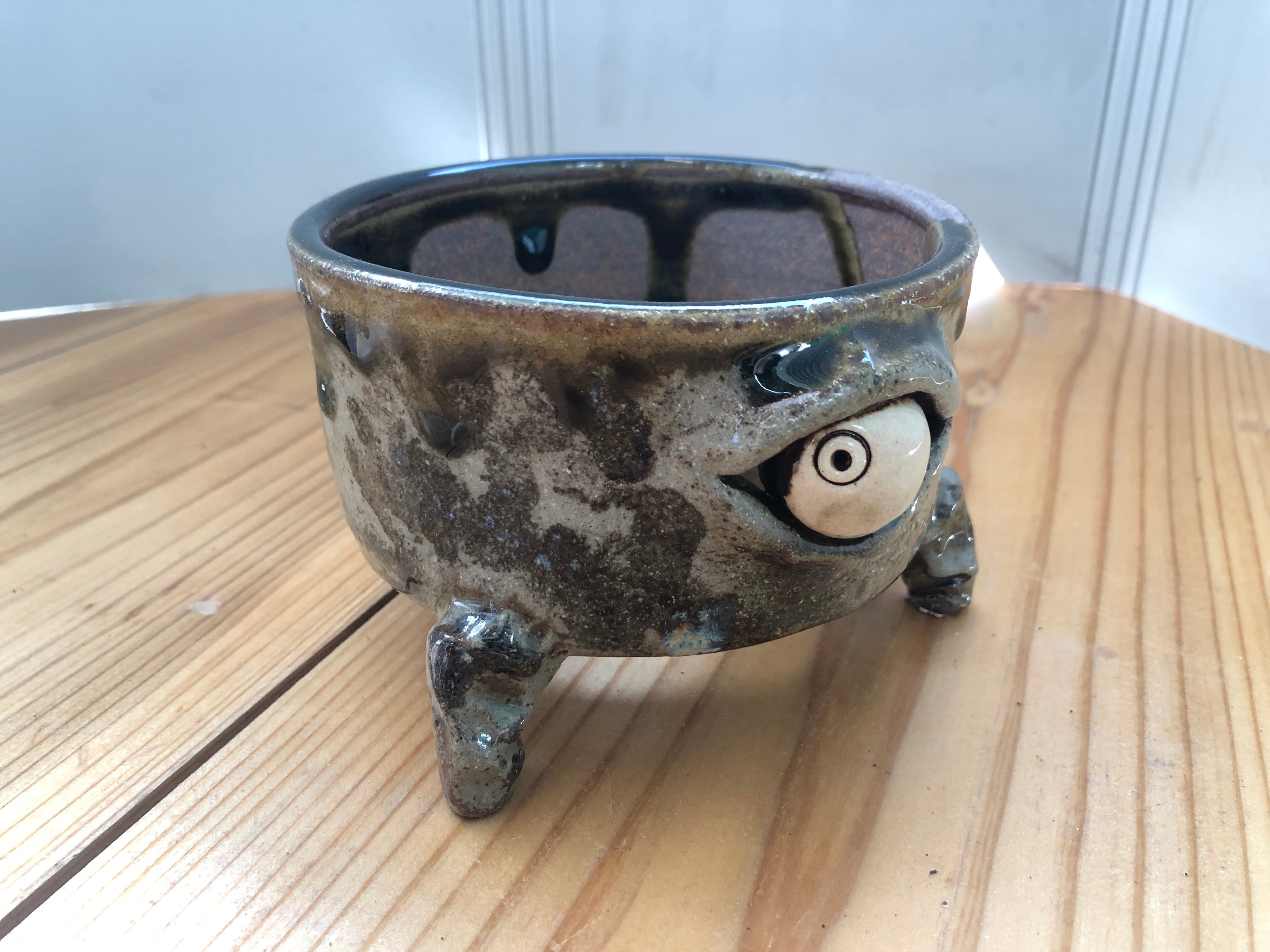 ロクロで成形した鉢に、手び練りで「ひとつ目」をあしらった一点物の作品です。
