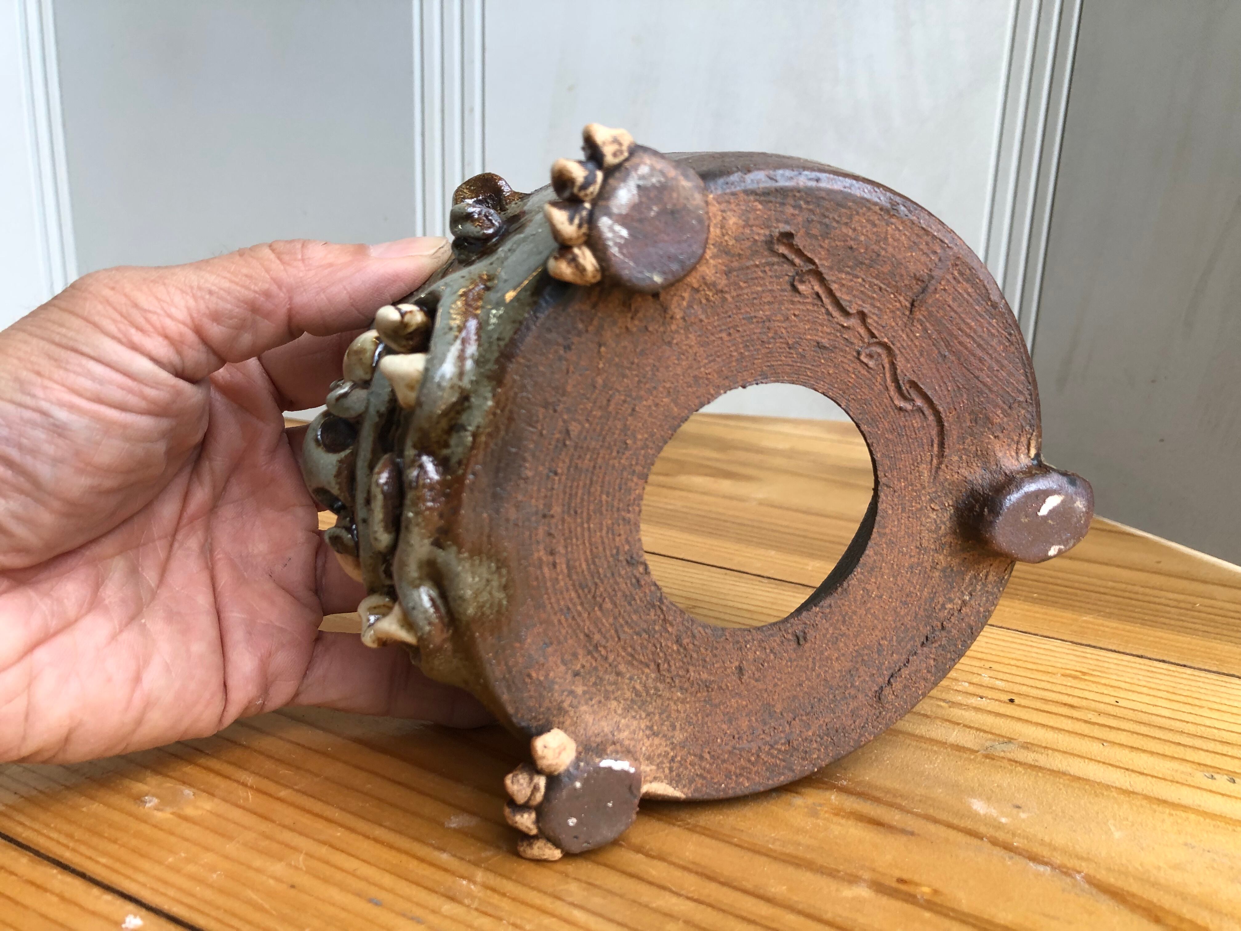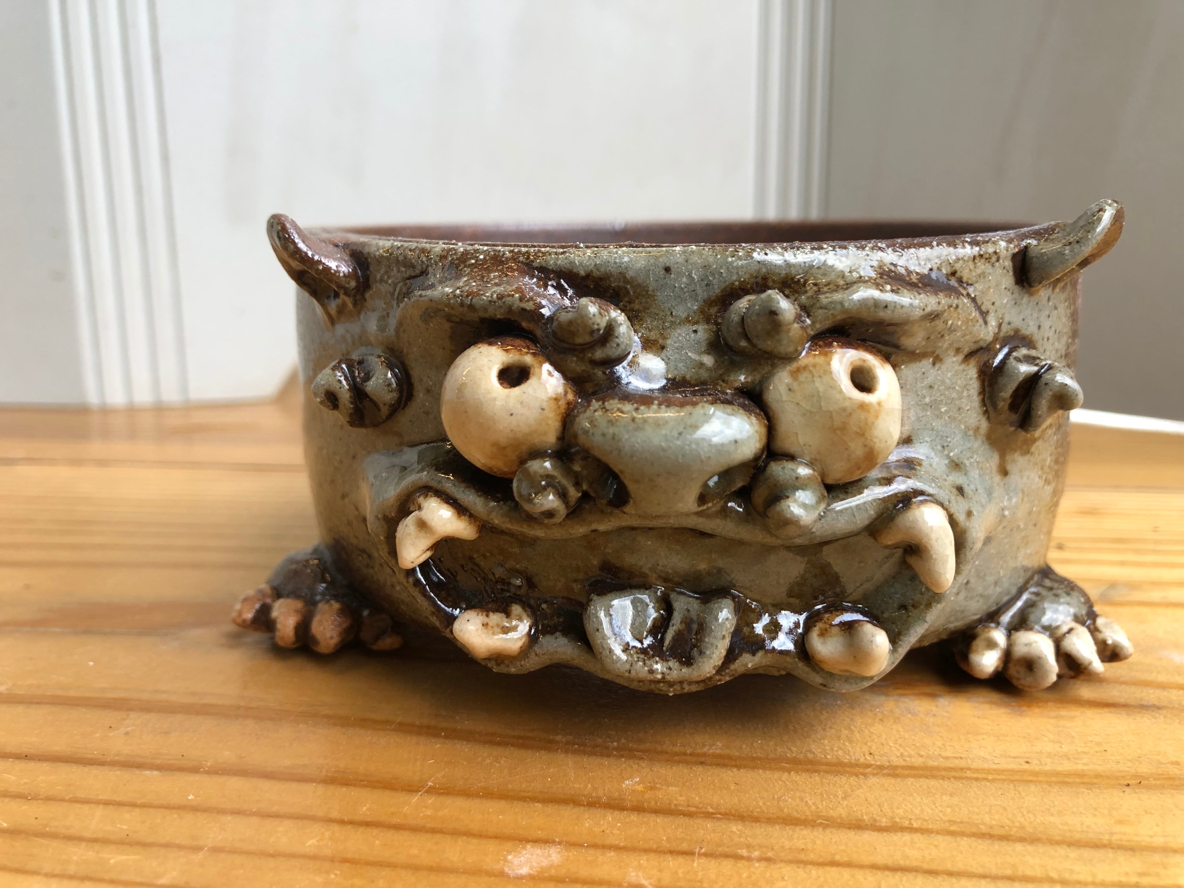 ロクロで成形した小ぶりな鉢に、手び練りでシーサーをあしらった一点物の作品です。